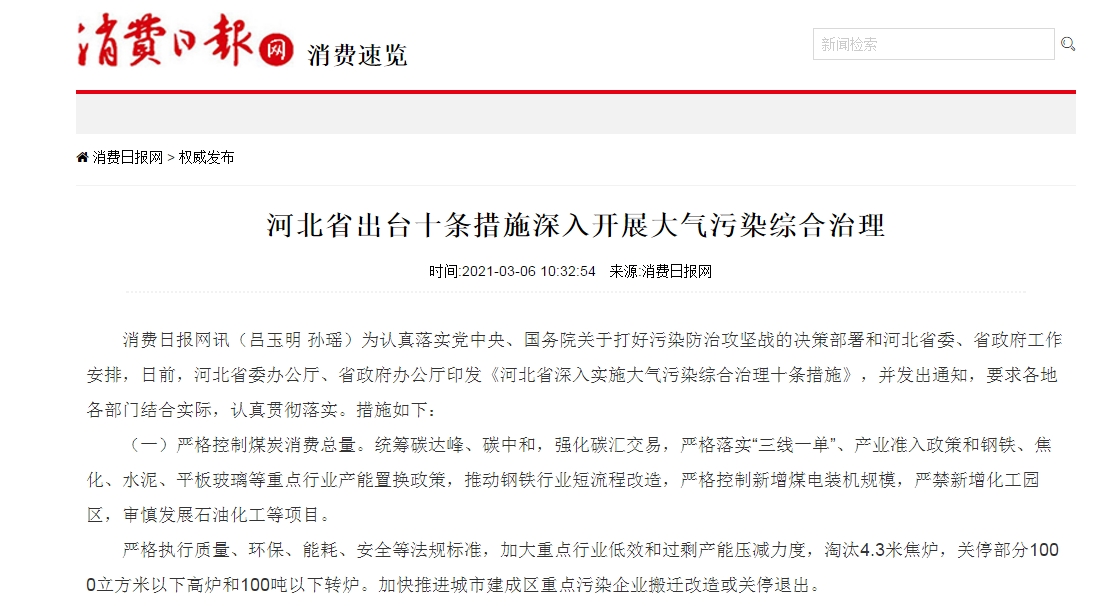 关于打好污染防治攻坚战的决策部署和河北省委、省政府工作安排,日前,河北省委办公厅、省政府办公厅印发《河北省深入实施大气污染综合治理十条措施》,并发出通知,要求各地各部门结合实际,认真贯彻落实。措施如下: