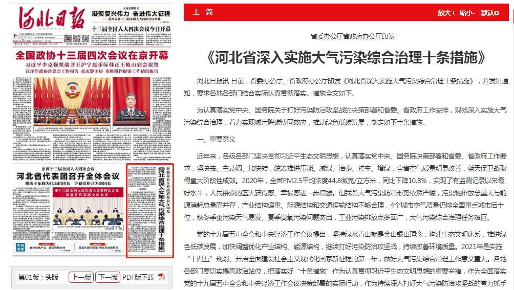 党的十九届五中全会和中央经济工作会议提出,坚持绿水青山就是金山银山理念,构建生态文明体系,推进绿色低碳发展,加快调整优化产业结构、能源结构,继续打好污染防治攻坚战,持续改善环境质量。2021年是实施“十四五”规划、开启全面建设社会主义现代化国家新征程的第一年,做好大气污染综合治理工作意义重大。各地各部门要切实提高政治站位,把落实好“十条措施”作为认真贯彻习近平生态文明思想的重要举措,作为全面落实党的十九届五中全会和中央经济工作会议决策部署的实际行动,作为持续深入打好大气污染防治攻坚战的有力抓手和2021年大气污染综合治理任务的重中之重,更加突出精准治污、科学治污、依法治污,确保完成2021年全省PM2.5平均浓度下降3%以上的全年目标任务,唐山市、邢台市退出污染城市后十名,全力以赴推动全省空气质量持续改善,以优异成绩庆祝建党100周年。