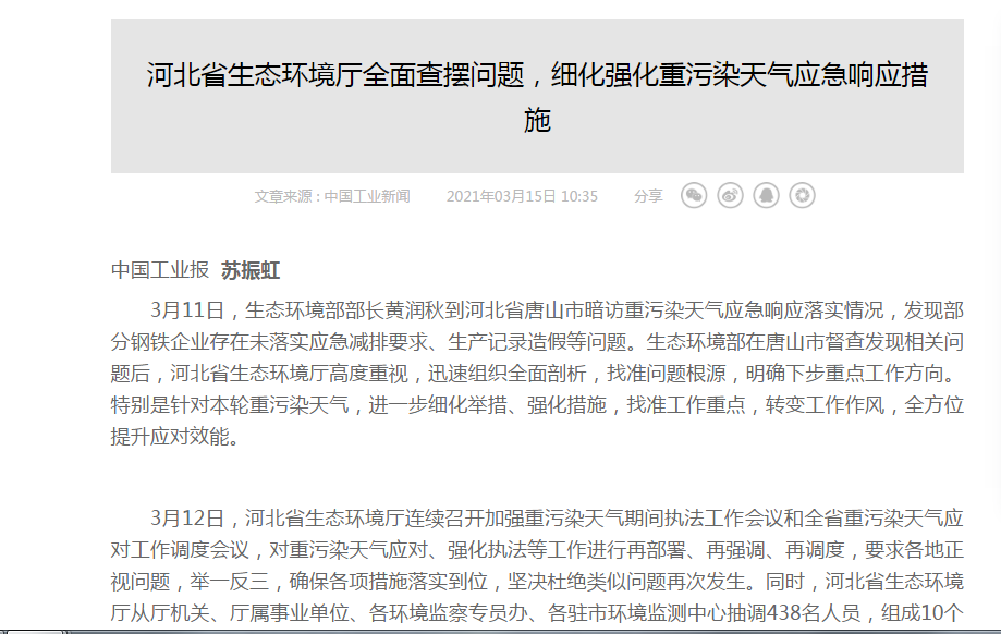 河北省将以此次91直播部发现问题整改为契机,狠抓大气污染综合治理十条措施落地落实,深入打好大气污染防治攻坚战;对重污染天气应对措施开展全面评估,查摆漏洞和薄弱环节,完善应急减排措施,切实提高应对工作水平。围绕钢铁、焦化等主要排污大户及绩效评级企业,常态化开展大气环境执法专项行动,重点检查无组织排放管控不到位、应急减排措施落实不到位等突出环境违法问题。在全系统开展“谈认识、找差距、严整改、强落实”作风整顿活动,狠抓队伍素质建设和能力建设,持续打造91直播执法队伍。严格考核问责,对重点任务措施落实组织不力、推进缓慢、逾期未完成目标任务,特别是对重污染应急响应期间预案启动不及时、应对工作不力、措施落实不到位的地方政府、单位和责任人严肃追责问责,努力形成政府守土有责、部门协调联动、全社会共同参与的协同治霾格局。
