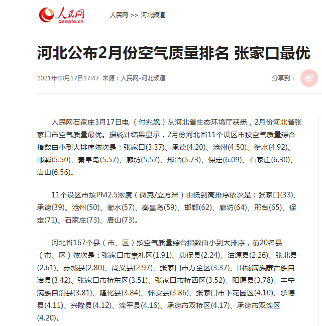 获悉,2月份河北省张家口市空气质量最优。据统计结果显示,2月份河北省11个设区市按空气质量综合指数由小到大排序依次是:张家口(3.37)、承德(4.20)、沧州(4.50)、衡水(4.92)、邯郸(5.50)、秦皇岛(5.57)、廊坊(5.57)、邢台(5.73)、保定(6.09)、石家庄(6.30)、唐山(6.56)。