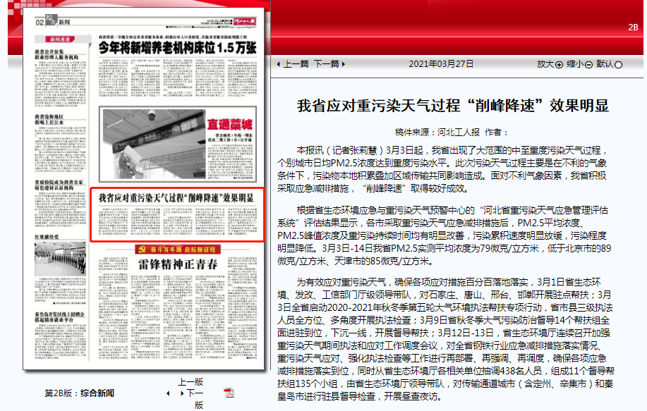 河北工人报:我省应对重污染天气过程“削峰降速”效果明显