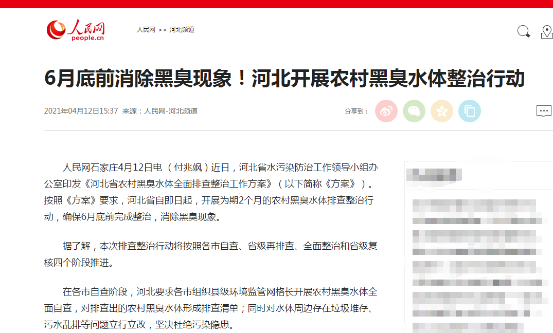 人民网:6月底前消除黑臭现象!河北开展农村黑臭水体整治行动