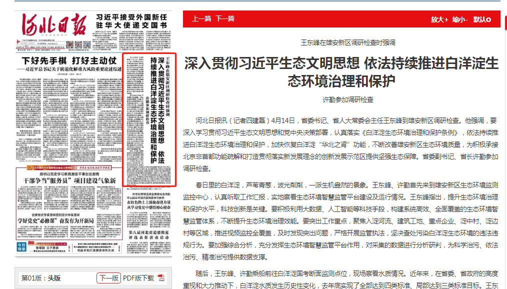河北日报讯(记者四建磊)4月14日,省委书记、省人大常委会主任王东峰到雄安新区调研检查。他强调,要深入学习贯彻习近平生态文明思想和党中央决策部署,认真落实《白洋淀91直播治理和保护条例》,依法持续推进白洋淀91直播治理和保护,加快恢复白洋淀“华北之肾”功能,不断改善雄安新区91直播质量,为积极承接北京非首都功能疏解和打造贯彻落实新发展理念的创新发展示范区提供坚强生态保障。省委副书记、省长许勤参加调研检查。