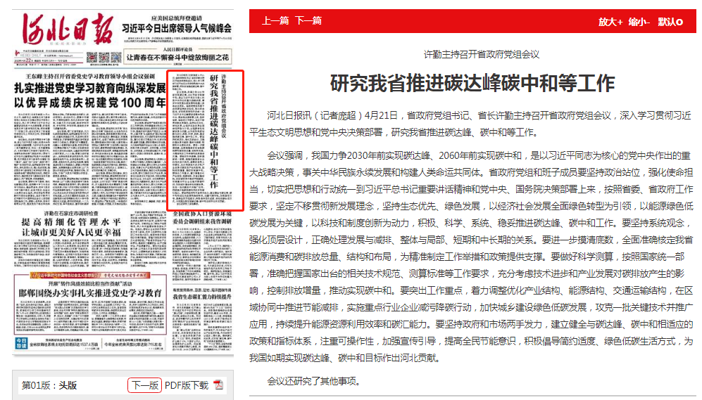 河北日报讯(记者庞超)4月21日,省政府党组书记、省长许勤主持召开省政府党组会议,深入学习贯彻习近平生态文明思想和党中央决策部署,研究我省推进碳达峰、碳中和等工作。