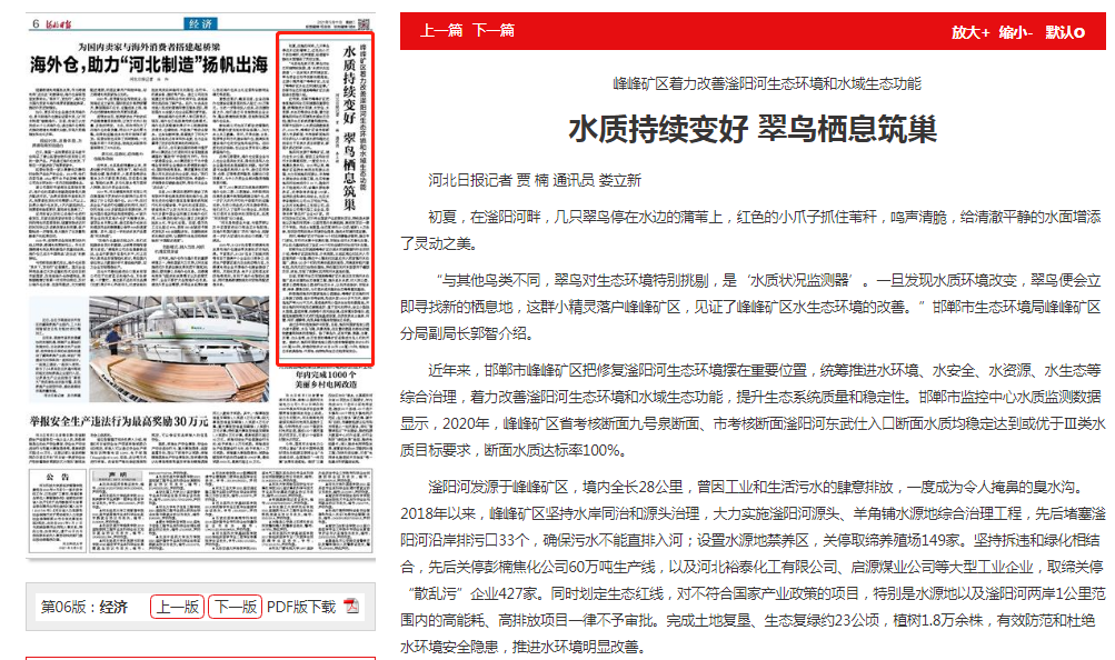 积极推进滏阳河国家湿地公园建设。峰峰矿区在滏阳河上修建了游园、溢水坝等设施,形成水面16000多平方米,保护湿地芦苇3000平方米,营造鱼类和小型水生生物的栖息地,并结合滏阳河河流形态蜿蜒曲折、富于变化的特点,设立小型挡水围堰,塑造深潭、浅滩等不同河流生境;在深潭采取堆石、栽植湿地植物等方式进行湿地基底恢复,自然放养本土鱼类、河蟹、河虾、螺蛳等,构筑具备完整食物链生态系统。