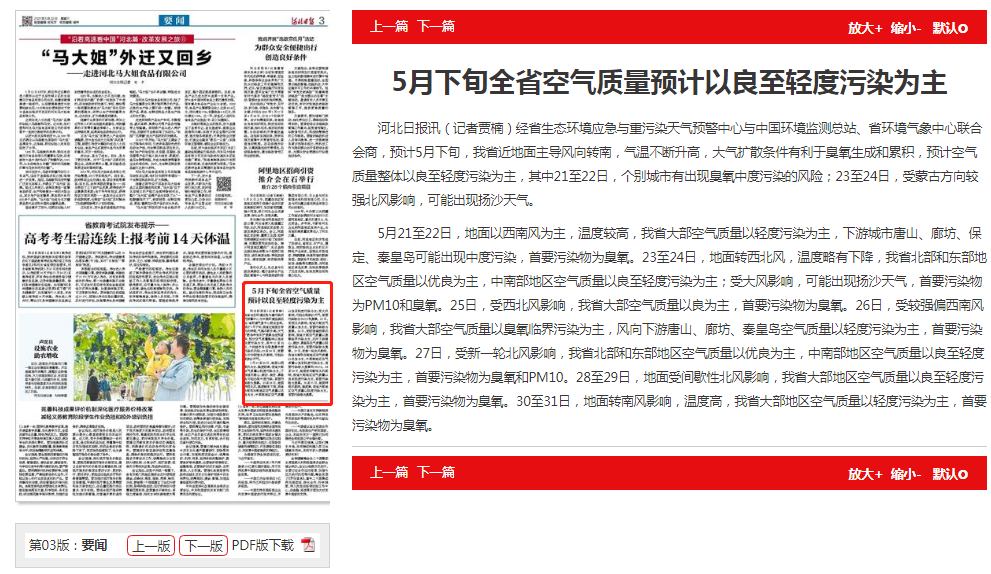 河北日报:5月下旬全省空气质量预计以良至轻度污染为主