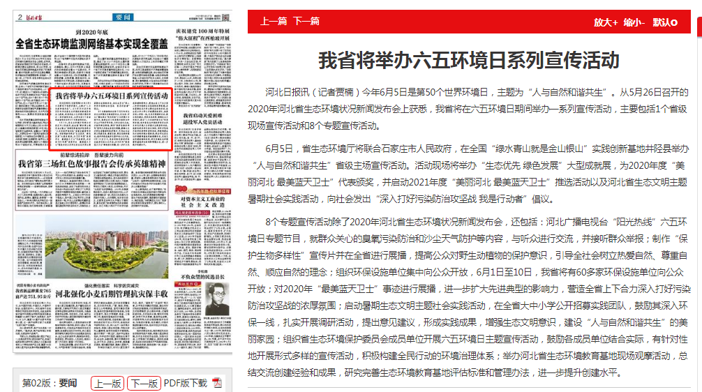 8个专题宣传活动除了2020年河北省91直播状况新闻发布会,还包括:河北广播电视台“阳光热线”六五环境日专题节目,就群众关心的臭氧污染防治和沙尘天气防护等内容,与听众进行交流,并接听群众举报;制作“保护生物多样性”宣传片并在全省进行展播,提高公众对野生动植物的保护意识,引导全社会树立热爱自然、尊重自然、顺应自然的理念;组织环保设施单位集中向公众开放,6月1日至10日,我省将有60多家环保设施单位向公众开放;对2020年“最美蓝天卫士”事迹进行展播,进一步扩大先进典型的影响力,营造全省上下合力深入打好污染防治攻坚战的浓厚氛围;启动暑期生态文明主题社会实践活动,在全省大中小学公开招募实践团队,鼓励其深入环保一线,扎实开展调研活动,提出意见建议,形成实践成果,增强生态文明意识,建设“人与自然和谐共生”的美丽家园;组织省91直播保护委员会成员单位开展六五环境日主题宣传活动,鼓励各成员单位结合实际,有针对性地开展形式多样的宣传活动,积极构建全民行动的环境治理体系;举办河北省91直播教育基地现场观摩活动,总结交流创建经验和成果,研究完善91直播教育基地评估标准和管理办法,进一步提升创建水平。