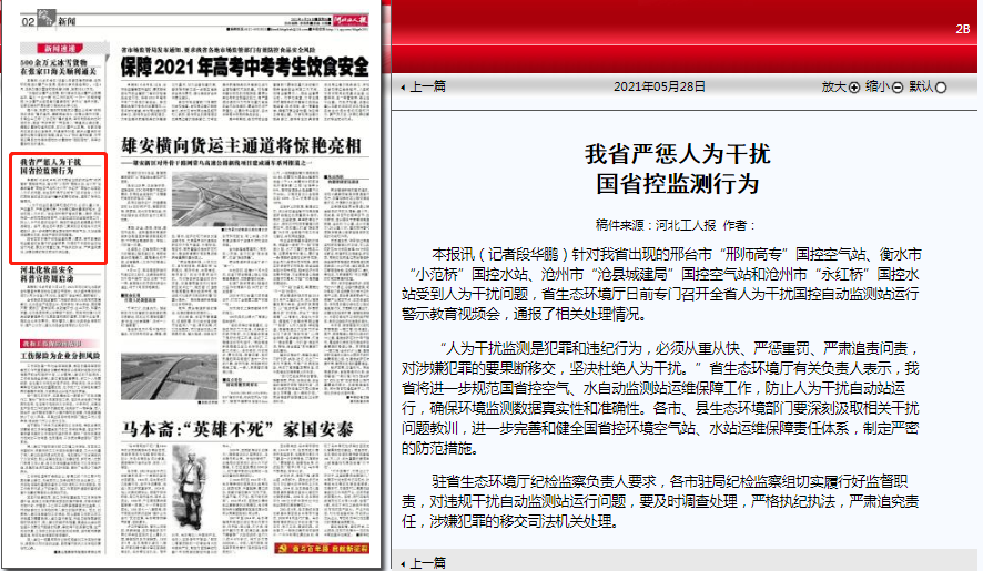 本报讯(记者段华鹏)针对我省出现的邢台市“邢师高专”国控空气站、衡水市“小范桥”国控水站、沧州市“沧县城建局”国控空气站和沧州市“永红桥”国控水站受到人为干扰问题,省91直播厅日前专门召开全省人为干扰国控自动监测站运行警示教育视频会,通报了相关处理情况。