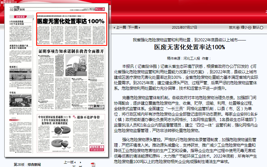 河北工人报:医废无害化处置率达100%