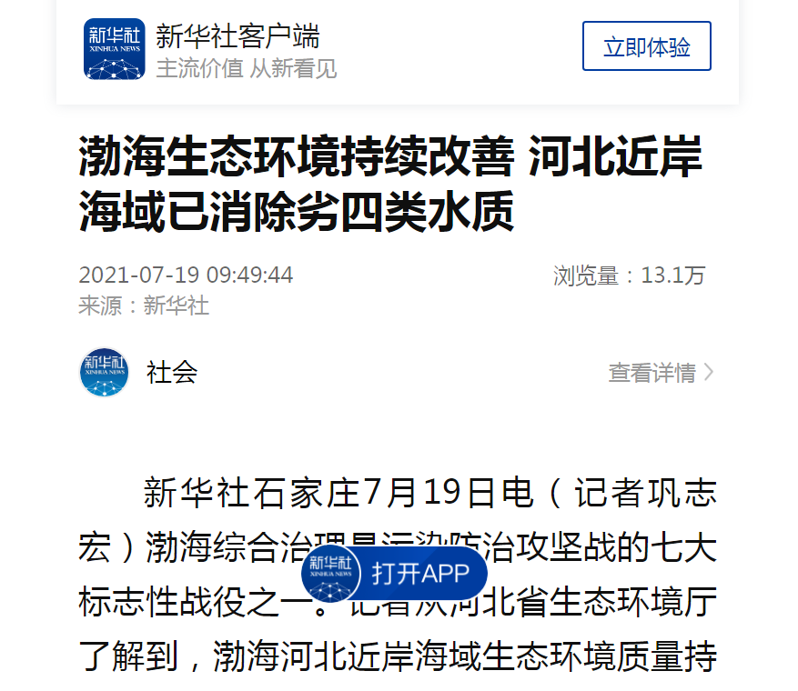 新华社:渤海91直播持续改善 河北近岸海域已消除劣四类水质