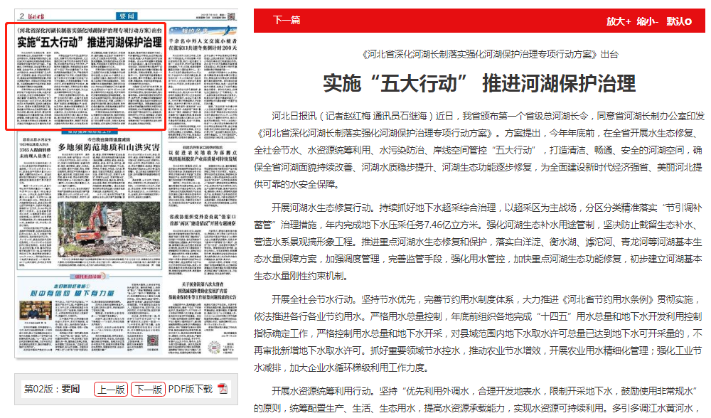 河北日报讯(记者赵红梅 通讯员石继海)近日,我省颁布第一个省级总河湖长令,同意省河湖长制办公室印发《河北省深化河湖长制落实强化河湖保护治理专项行动方案》。方案提出,今年年底前,在全省开展水生态修复、全社会节水、水资源统筹利用、水污染防治、岸线空间管控“五大行动”,打造清洁、畅通、安全的河湖空间,确保全省河湖面貌持续改善、河湖水质稳步提升、河湖生态功能逐步修复,为全面建设新时代经济强省、美丽河北提供可靠的水安全保障。