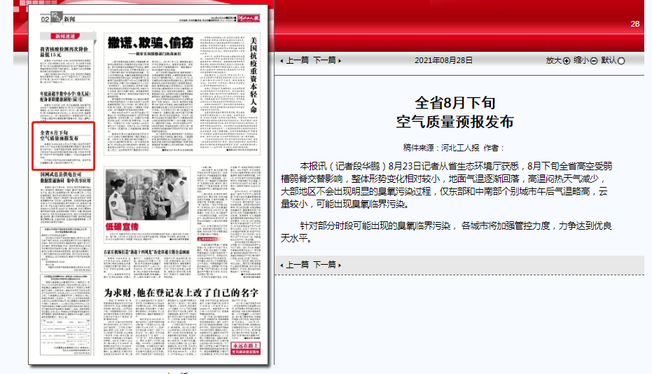 河北工人报:全省8月下旬空气质量预报发布 来源:河北省91直播宣传教育中心 时间:2021-08-30