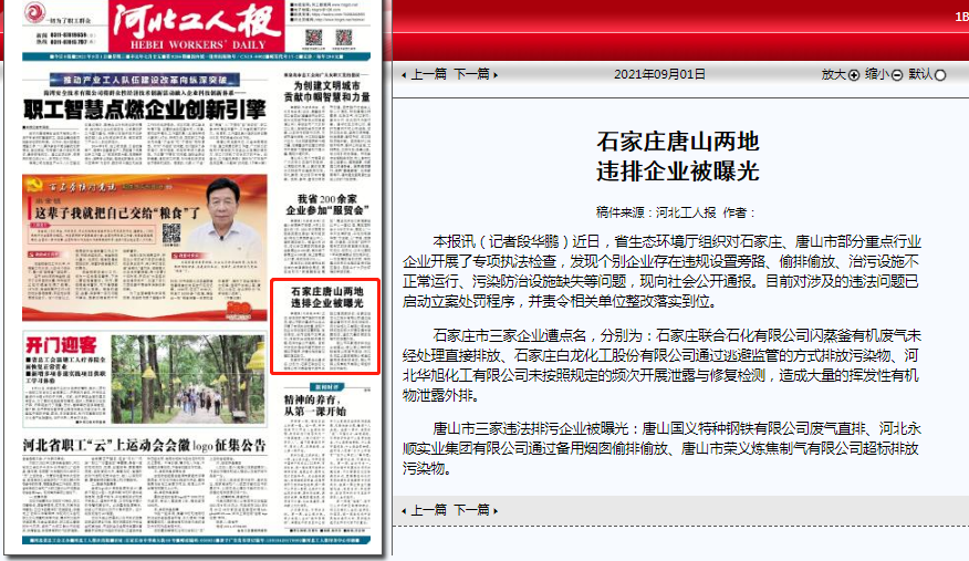 石家庄市三家企业遭点名,分别为:石家庄联合石化有限公司闪蒸釜有机废气未经处理直接排放、石家庄白龙化工股份有限公司通过逃避监管的方式排放污染物、河北华旭化工有限公司未按照规定的频次开展泄露与修复检测,造成大量的挥发性有机物泄露外排。