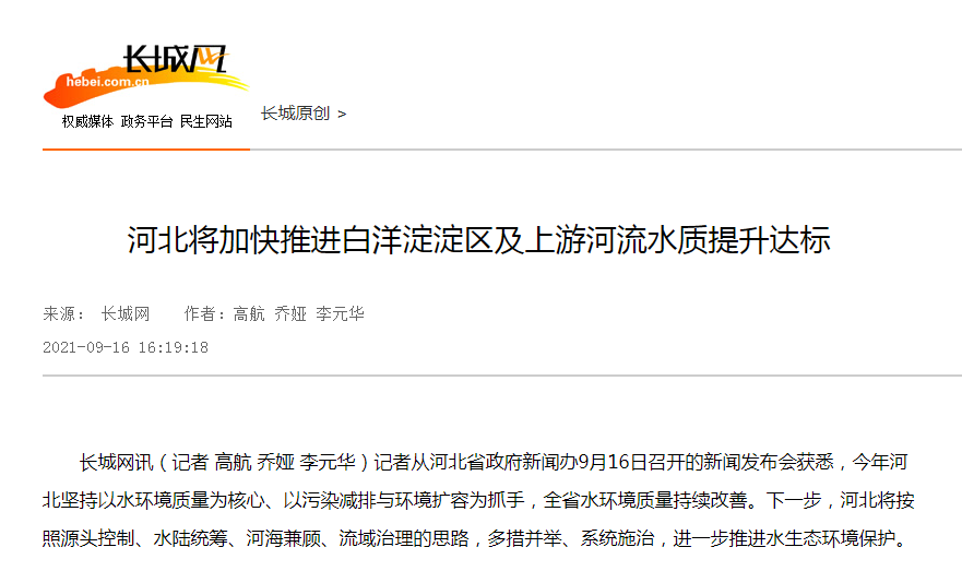 长城网:河北将加快推进白洋淀淀区及上游河流水质提升达标