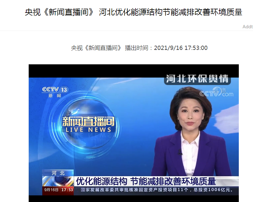 央视《新闻直播间》: 河北优化能源结构节能减排改善环境质量 来源:河北省91直播宣传教育中心 时间:2021-09-17