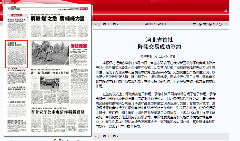 在签约仪式上,河北省御道口林场、承德市滦平国有林场总场于营子林场、承德市狮子沟国有林场分别与唐山港陆钢铁有限公司、河北荣信钢铁有限公司、唐山市丰南区经安钢铁有限公司签订降碳产品生态价值实现协议进行交易,省91直播厅、建设银行河北省分行签订河北省碳中和试点战略合作协议,张家口市政府、建设银行河北省分行签订碳中和(氢能)绿色产业投资基金合作协议,中国石化石油工程技术研究院、中石化南京化工研究院有限公司、中国地质调查局水文地质环境地质调查中心、中国生物多样性保护与绿色发展基金会、河钢集团成立河北省二氧化碳捕集利用与封存(CCUS)产业技术联盟。