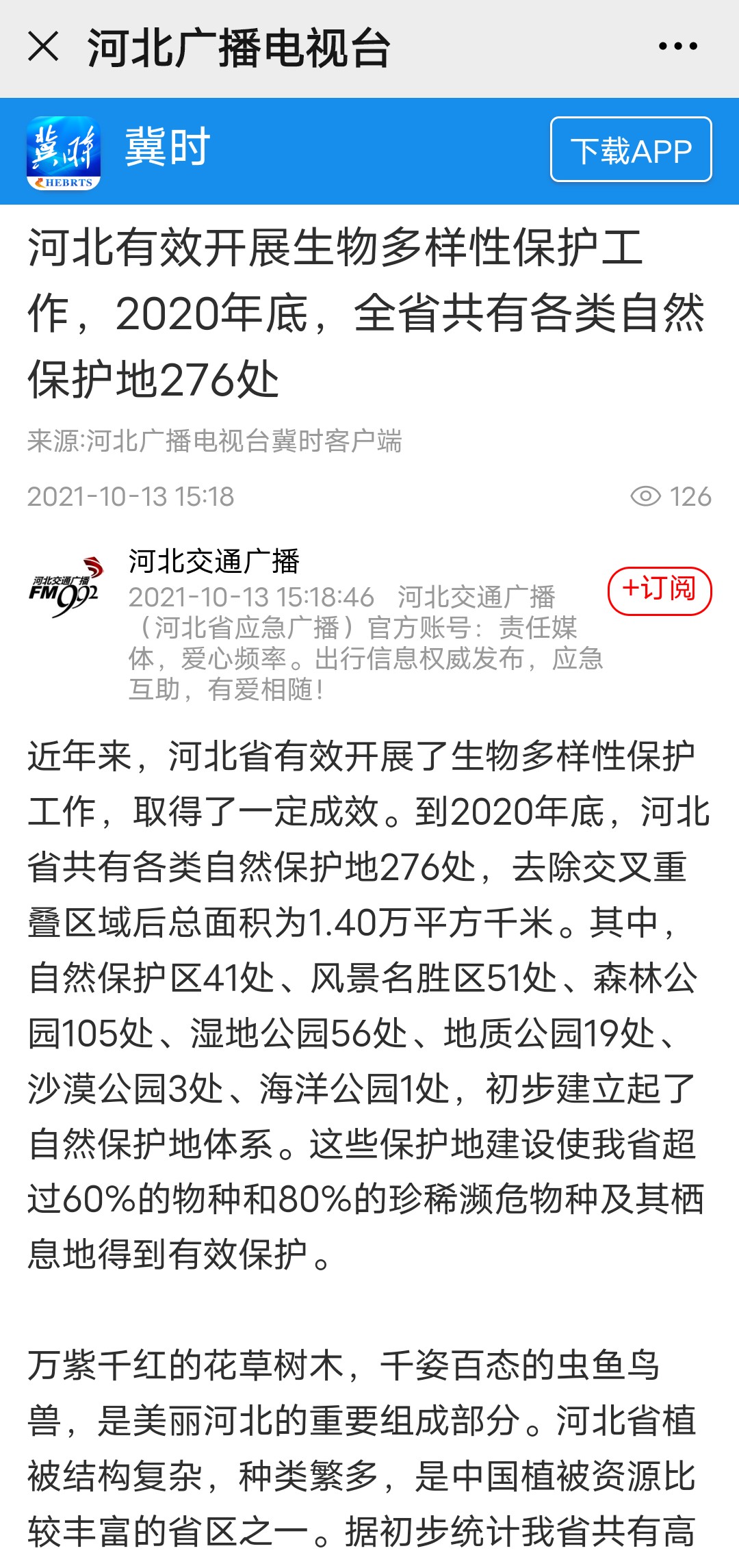 河北广播电视台冀时客户端:河北有效开展生物多样性保护工作,2020年底,全省共有各类自然保护地276处