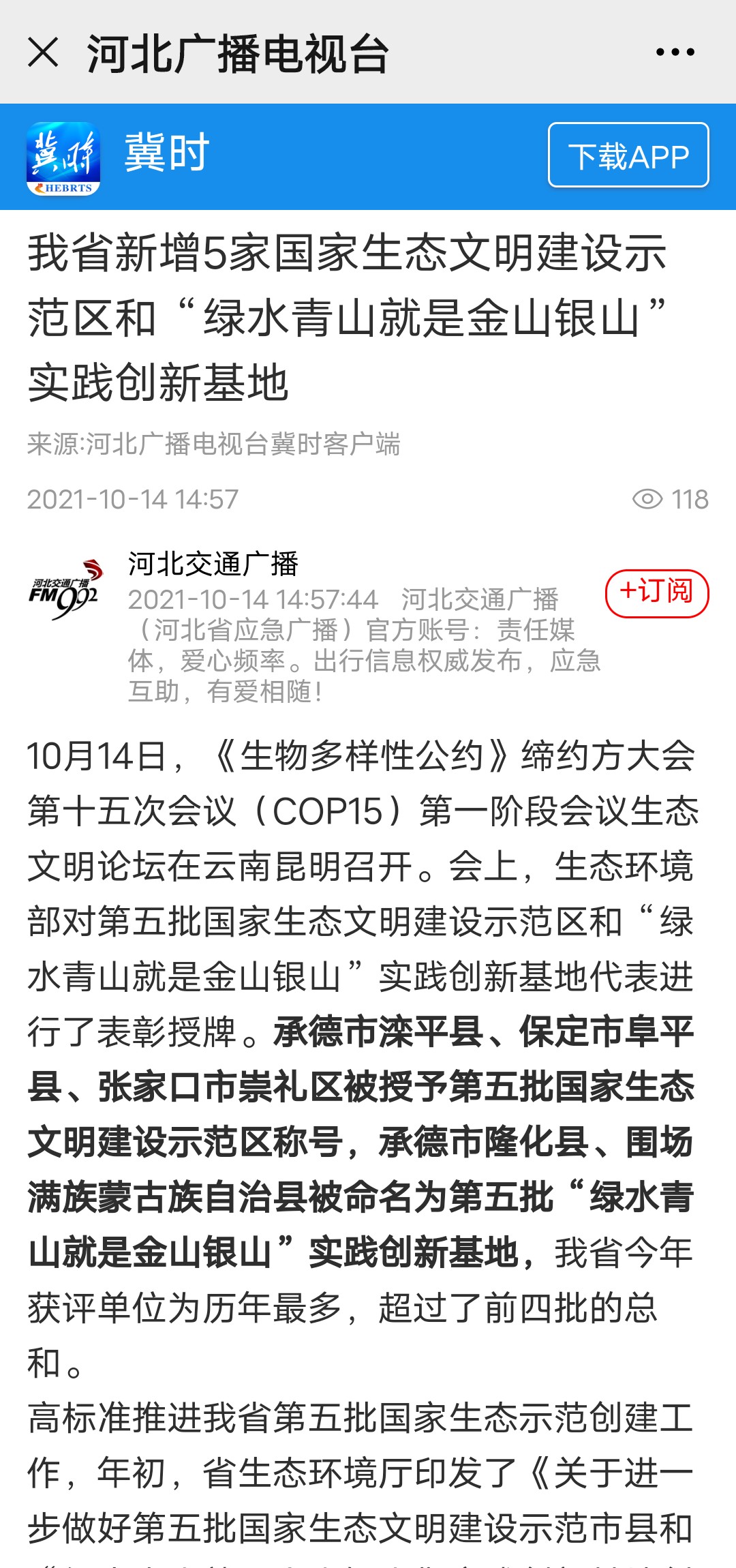 河北广播电视台冀时客户端:我省新增5家国家生态文明建设示范区和“绿水青山就是金山银山”实践创新基地