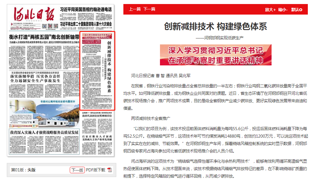 河钢邯钢相关负责人表示,钢铁行业在碳达峰行动中具有举足轻重的地位,是率先落实碳达峰的重要行业,是地方落实碳达峰的关键环节。他们将继续抓好创新赋能、绿色赋能、生态赋能,加大低碳技术研发和推广力度,促进钢铁行业绿色低碳发展,为建设经济强省、美丽河北作出更大贡献,助力国家早日实现“碳达峰、碳中和”目标。