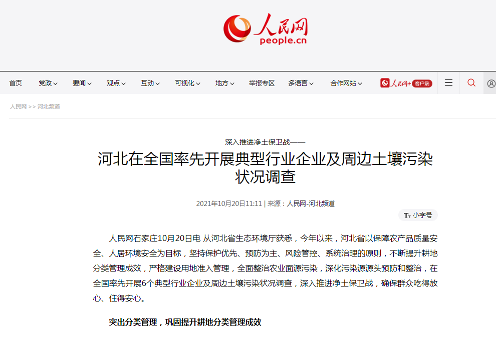 人民网:河北在全国率先开展典型行业企业及周边土壤污染状况调查
