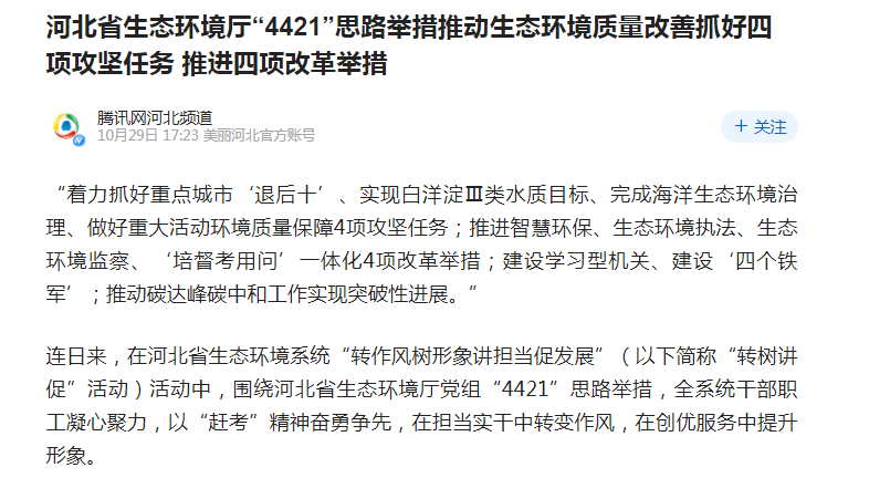 扎实推进“4421”思路举措,河北省91直播系统坚持省、市、县三级联动,以深入开展“转树讲促”活动为抓手,总体部署、同步推进,以作风大提升,纪律大整顿,促进91直播工作攻坚克难,取得实效,深入打好污染防治攻坚战,生态文明建设再谱新篇章。