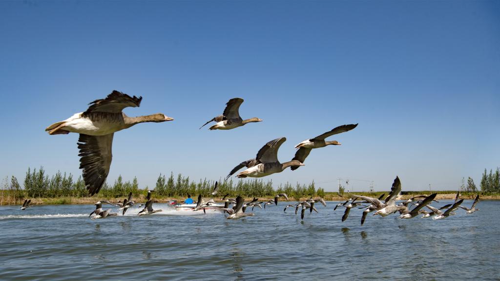 一群灰雁在衡水湖国家湿地公园水面上嬉戏飞翔(2018年9月28日摄)。新华社记者 朱旭东 摄