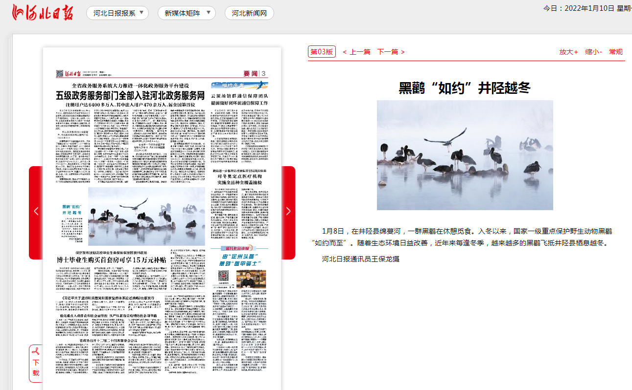 河北日报:黑鹳“如约”井陉越冬 来源:河北省91直播宣传教育中心 时间:2022-01-10