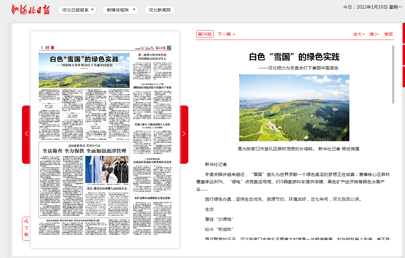 “坝上地区具有优质风能和太阳能,是国家规划的9个千万千瓦级风电基地之一。在拥有多项世界第一的张北柔性直流工程投运后,奥运史上首次实现全部场馆绿色电力全覆盖。”国网冀北电力副总工程师兼冬奥办主任康健民说。到冬残奥会结束时,崇礼冬奥会场馆预计消耗“绿电”约4亿千瓦时,预计减少标煤燃烧12.8万吨,减排二氧化碳32万吨。