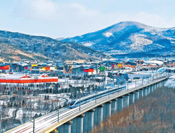 京张携手办冬奥,同心绽放一朵雪花。图为连通两地的复兴号智能动车组经过张家口崇礼太子城冰雪小镇 孙立君摄