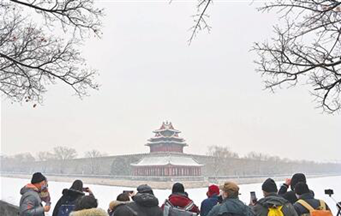 1月22日,在北京故宫角楼,市民和游客在拍摄雪景,雪后的京城一片银装素裹。新华社发