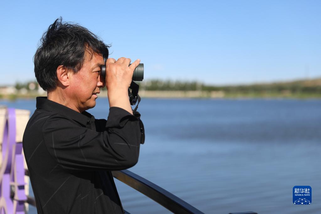 在河北省张家口市康保县康巴诺尔国家湿地公园,麻喜荣在观测野生鸟类。 (新华社记者骆学峰 摄)