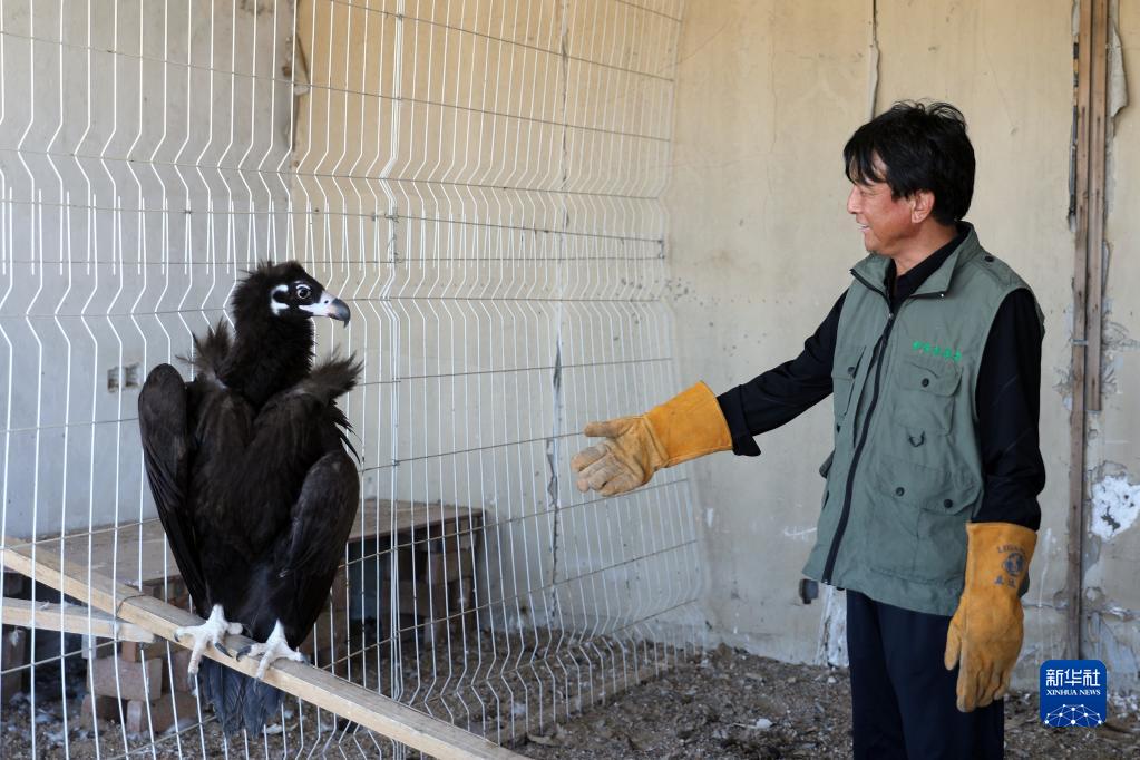 在河北省张家口市康保县遗鸥保护协会野生动物救助站,麻喜荣在查看救助的秃鹫。(新华社记者骆学峰 摄)