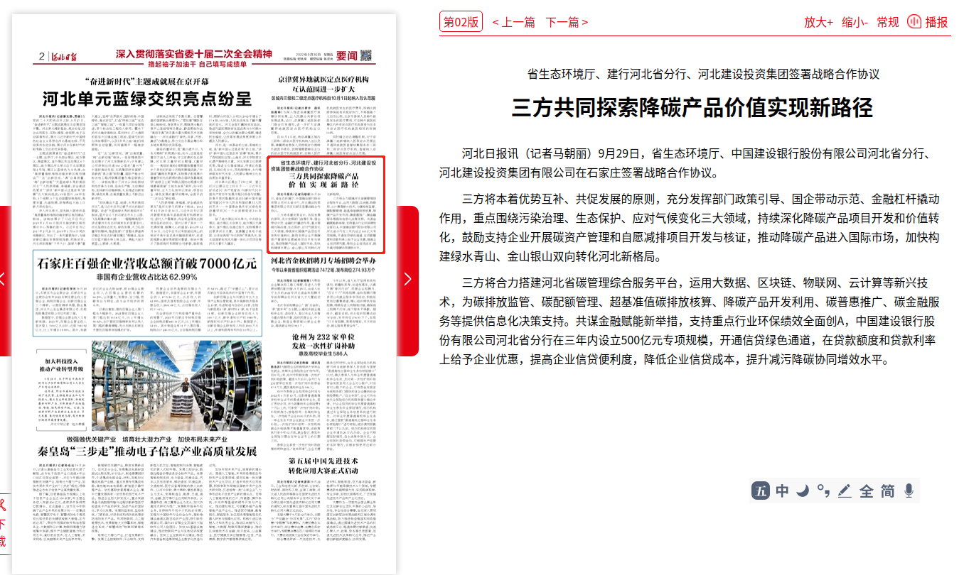 三方将合力搭建河北省碳管理综合服务平台,运用大数据、区块链、物联网、云计算等新兴技术,为碳排放监管、碳配额管理、超基准值碳排放核算、降碳产品开发利用、碳普惠推广、碳金融服务等提供信息化决策支持。共谋金融赋能新举措,支持重点行业环保绩效全面创A,中国建设银行股份有限公司河北省分行在三年内设立500亿元专项规模,开通信贷绿色通道,在贷款额度和贷款利率上给予企业优惠,提高企业信贷便利度,降低企业信贷成本,提升减污降碳协同增效水平。