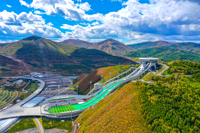 蓝天白云下的国家跳台滑雪中心。 马佳琦摄