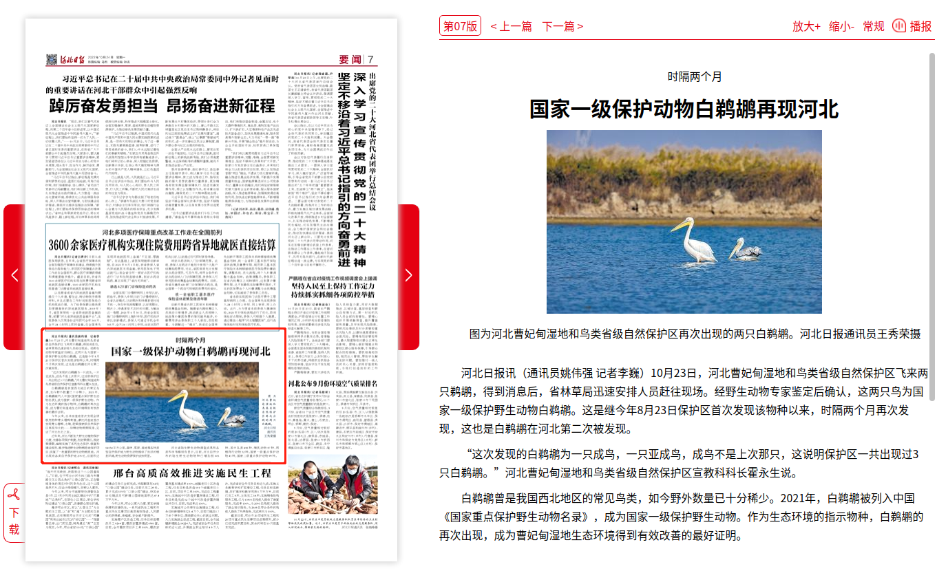 河北日报:时隔两个月国家一级保护动物白鹈鹕再现河北