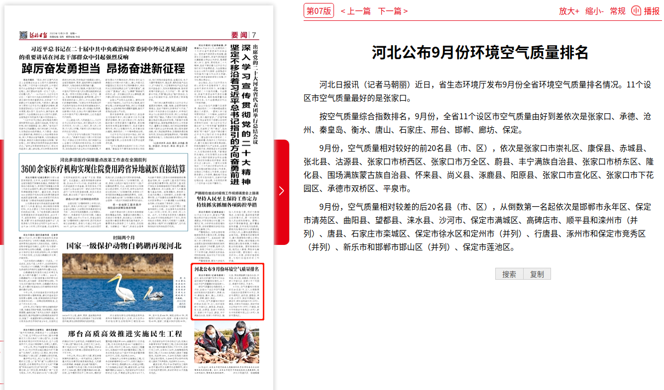 9月份,空气质量相对较差的后20名县(市、区),从倒数第一名起依次是邯郸市永年区、保定市清苑区、曲阳县、望都县、涞水县、沙河市、保定市满城区、高碑店市、顺平县和滦州市(并列)、唐县、石家庄市栾城区、保定市徐水区和定州市(并列)、行唐县、涿州市和保定市竞秀区(并列)、新乐市和邯郸市邯山区(并列)、保定市莲池区。