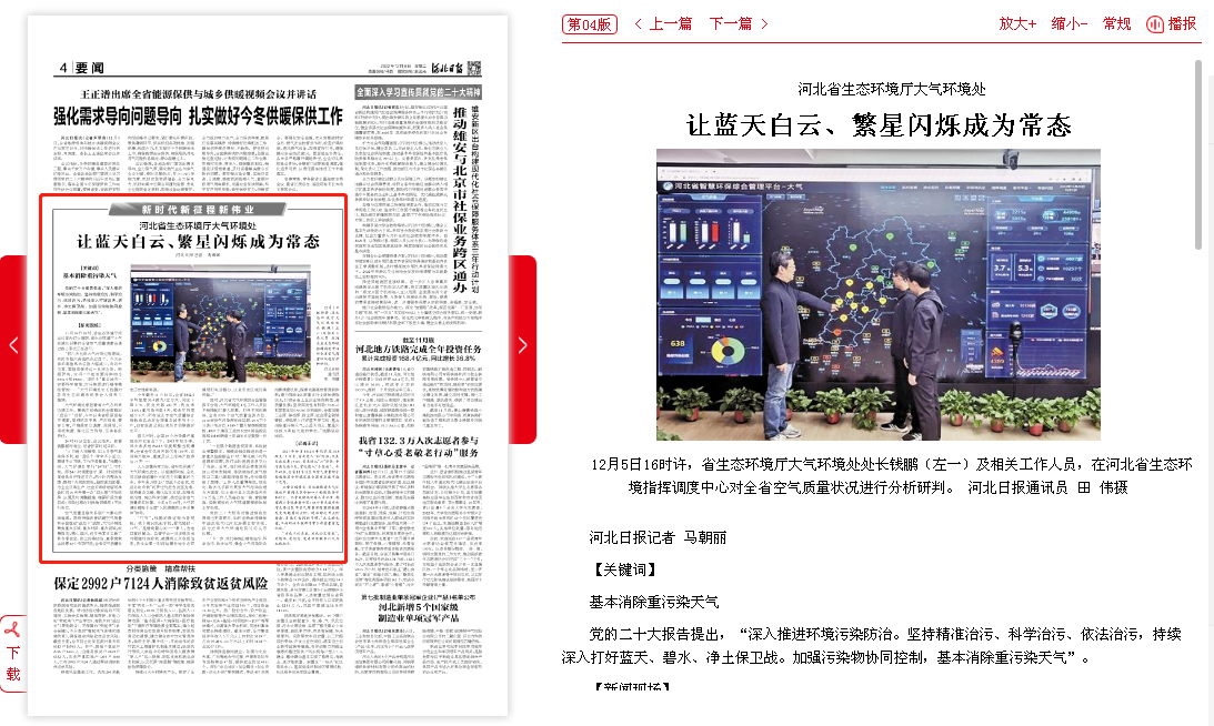 “一旦哪个数据出现异常,系统就会报警提示。傍晚给钱处推送的是一家重点监控钢企17时二氧化硫小时均值超标问题,我们当时就将信息交办了当地。后来,他们经现场核查发现该公司突发跳闸,导致烧结机废气排放口二氧化硫超限值排放,经抢修排除了故障。”工作人员董博翔说,信息化、数字化手段已贯穿大气污染治理方方面面,加上省市县乡四级每天有1.5万名工作人员奋战在一线,管控精准、运转高效的大气环境管理新体制正在形成。