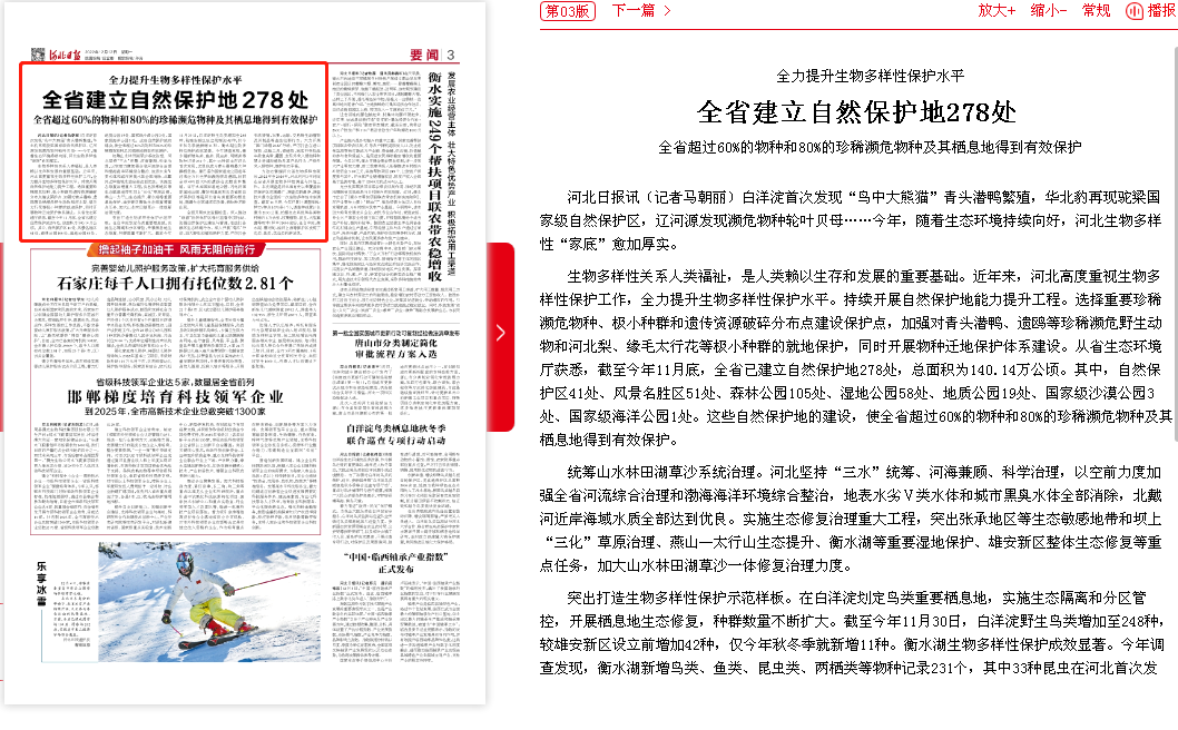 河北日报:全力提升生物多样性保护水平 全省建立自然保护地278处