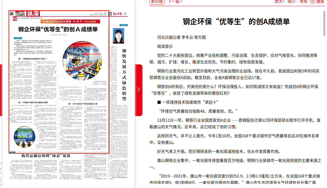 目前,唐山市已有11家钢铁企业创A,总量居全省第一。唐山钢铁行业一氧化碳减排工程,也成为我省大气污染深度治理的生动实践。