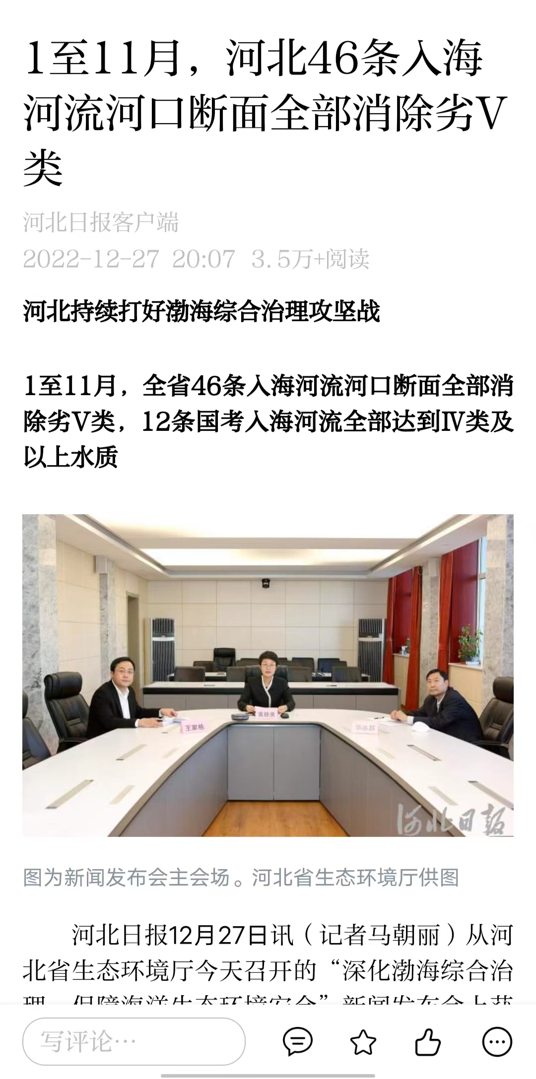 河北日报客户端:1至11月,河北46条入海河流河口断面全部消除劣V类