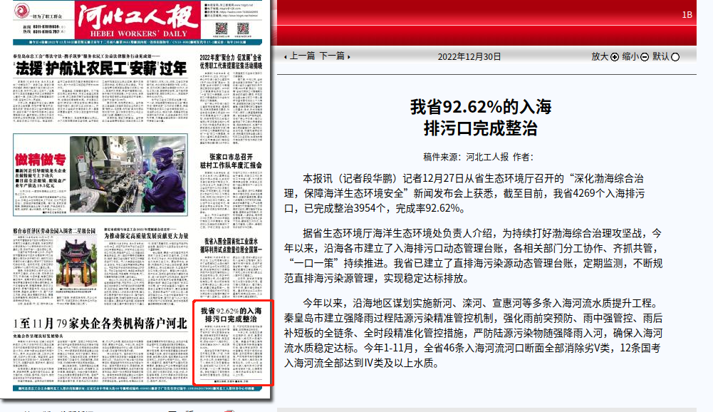 本报讯(记者段华鹏)记者12月27日从省91直播厅召开的“深化渤海综合治理,保障海洋91直播安全”新闻发布会上获悉,截至目前,我省4269个入海排污口,已完成整治3954个,完成率92.62%。
