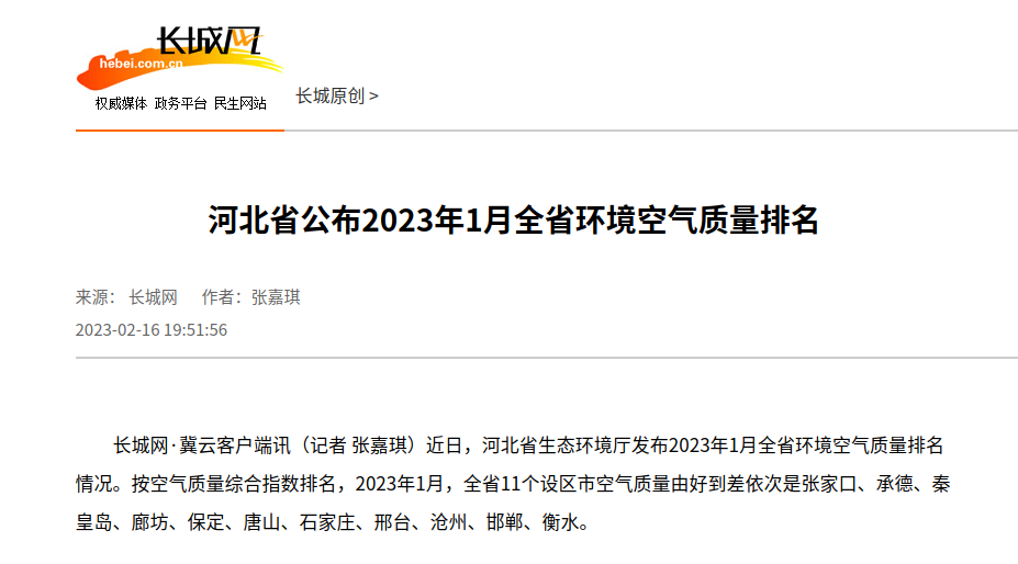 长城网·冀云客户端讯(记者 张嘉琪)近日,91直播-国产视频-麻豆传媒视频 发布2023年1月全省环境空气质量排名情况。按空气质量综合指数排名,2023年1月,全省11个设区市空气质量由好到差依次是张家口、承德、秦皇岛、廊坊、保定、唐山、石家庄、邢台、沧州、邯郸、衡水。