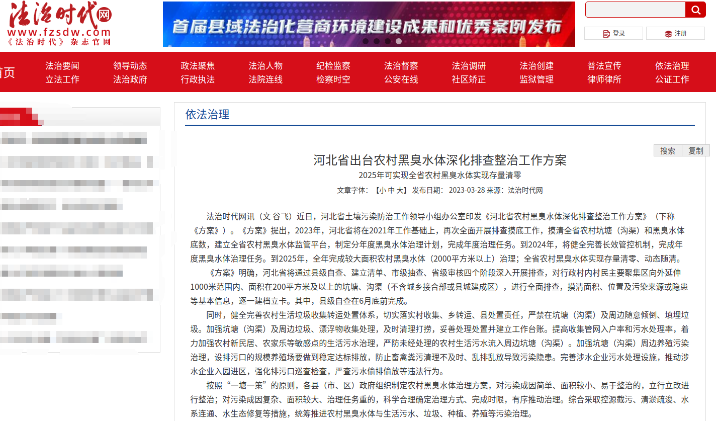 法治时代网讯(文 谷飞)近日,河北省土壤污染防治工作领导小组办公室印发《河北省农村黑臭水体深化排查整治工作方案》(下称《方案》)。《方案》提出,2023年,河北省将在2021年工作基础上,再次全面开展排查摸底工作,摸清全省农村坑塘(沟渠)和黑臭水体底数,建立全省农村黑臭水体监管平台,制定分年度黑臭水体治理计划,完成年度治理任务。到2024年,将健全完善长效管控机制,完成年度黑臭水体治理任务。到2025年,全年完成较大面积农村黑臭水体(2000平方米以上)治理;全省农村黑臭水体实现存量清零、动态随清。