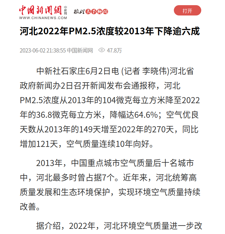 中新社石家庄6月2日电 (记者 李晓伟)河北省政府新闻办2日召开新闻发布会通报称,河北PM2.5浓度从2013年的104微克每立方米降至2022年的36.8微克每立方米,降幅达64.6%;空气优良天数从2013年的149天增至2022年的270天,同比增加121天,空气质量连续10年向好。