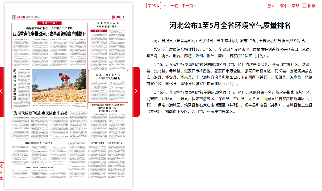 河北日报讯(记者马朝丽)6月14日,省91直播厅发布1至5月全省环境空气质量排名情况。
