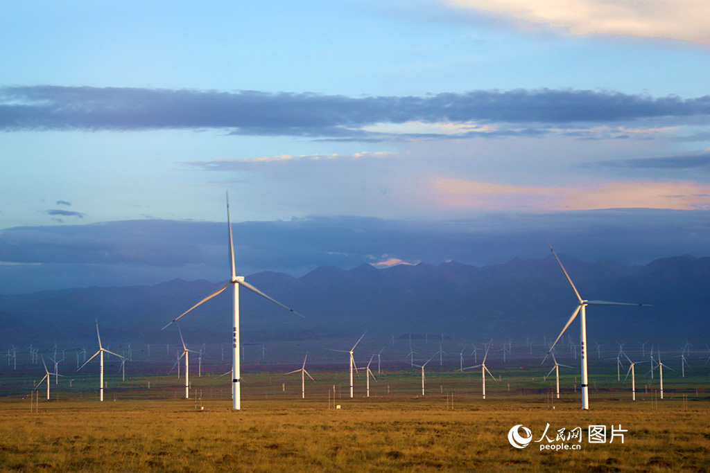 8月4日傍晚,青海省海南藏族自治州共和县境内,大型风力发电机随风旋转,与广袤的草原构成一幅风景画。汩汩绿电在这里积聚,一路向东,点亮中原之灯。人民网记者 杨启红摄