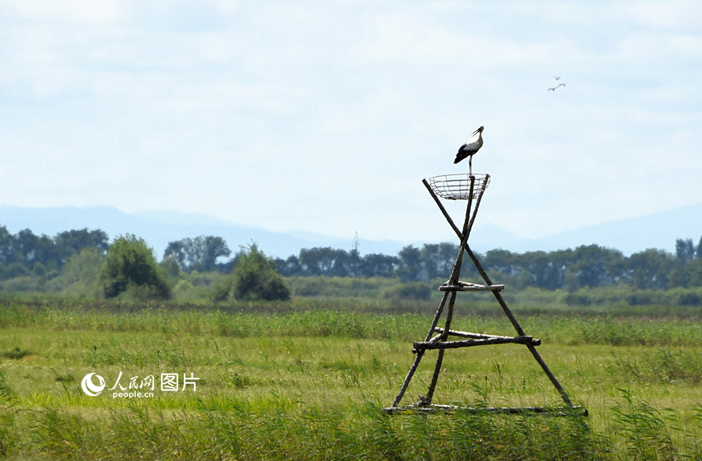 7月31日,在黑龙江挠力河国家级自然保护区的千鸟湖湿地,一只东方白鹳正屹立在人工鸟巢上。据了解,千鸟湖湿地是目前国内现存的较为完整、秀美并具备湿地生物多样性的一处生态景观。人民网记者 苏靖刚摄