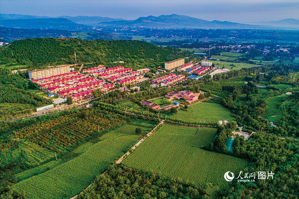 盛夏的河南省禹州市文殊镇陈南村,黄墙红丸,屋舍俨然,群山环绕,绿意浓浓。陈南村处在三河两岭中间,文化底蕴深厚,辖区内千亩核桃园区、油葵花海、铁山岭田园综合体已初具规模,2014年被评为“全国生态文化村”,2022年被评为“河南省乡村旅游特色村”。人民网记者 王玉兴摄