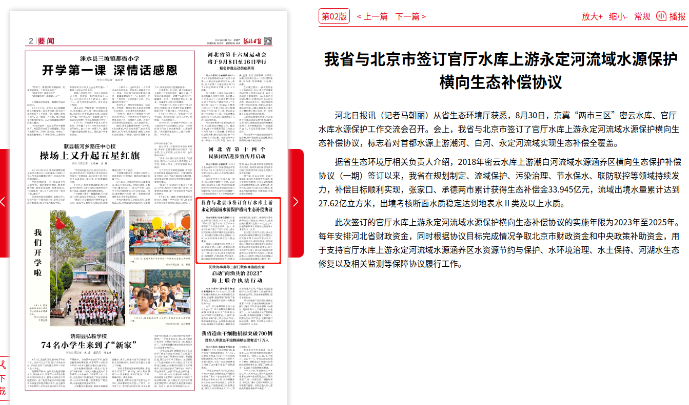 河北日报:我省与北京市签订官厅水库上游永定河流域水源保护横向生态补偿协议