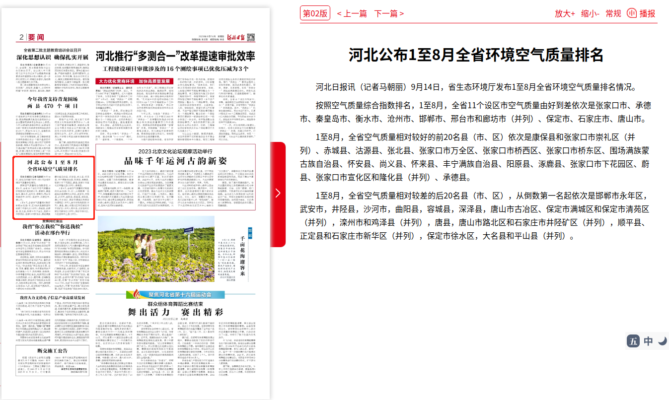 河北日报讯(记者马朝丽)9月14日,省91直播厅发布1至8月全省环境空气质量排名情况。